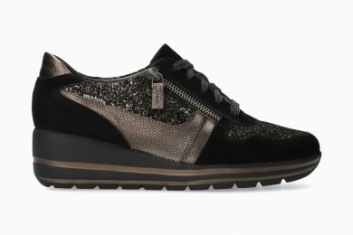 Este modelo negro para mujer está confeccionado en piel de ante en todo el pie, con piel brillante de efecto metalizado e inserciones de piel lisa granulada.