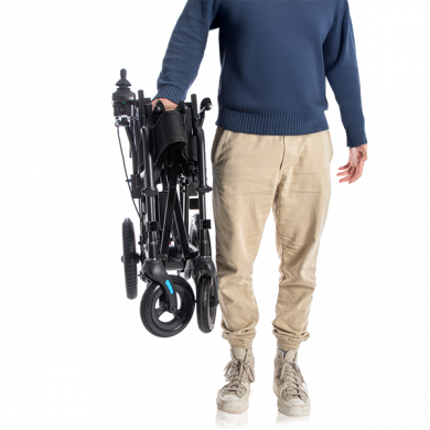 La silla iTaka se pliega de forma rápida y sencilla, reduciendo su tamaño a solo 32 cm de ancho, 68 cm de profundidad y 70 cm de alto. Gracias a su diseño compacto, es ideal para almacenarla en espacios reducidos o transportarla en el maletero de un vehículo. Como accesorio se le puede poner porta bastón para poder llevar de forma práctica un bastón y también permite añadir un soporte para instalar el mando de acompañante, brindando mayor comodidad y control.